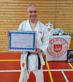 Karata Do Der Weg der leeren Hand "Das letzte Ziel des Karate- Do liegt nicht nur im Streben um den Sieg, sondern auch in der Vervollkommnung der Persönlichkeit der Karateka durch die körperliche Anstrengung." (Hideo Ochi, 9. DAN, Chiefinstructor des DJKB) Was ist Karate- Do? Karate ist ein Verteidigungssystem, bestehend aus Selbstverteidigung, Kampfsport, Körper- und Geistschulung. Die Kampfkunst wurde ursprünglich in China im Shaolin- Kloster entwickelt und kam durch wandernde Mönche über Okinawa schließlich nach Japan. Das Wort Karate setzt sich zusammen aus den japanischen Ausdrücken kara , was leer bedeutet, und te , was Hand bedeutet. Dies ist symbolisch für die Trainingsteilnehmer, Karateka genannt, die nur mit ihren Händen, Armen, Beinen und Füßen kämpfen, also unbewaffnet sind. Do steht für den Weg, bedeutet übertragen den Lebensweg, den der Karateka für sich gewählt hat. Karate- Do ist also der Weg der leeren Hand. Inhalte und Ziele im Karate Nicht Sieg oder Niederlage zählen: allein die Vervollkommnung des eigenen Charakters bildet das Ziel des Karate. (Wahlspruch der JKA, Japan Karate Association) Karate ist eine Ganzkörpersportart. Wie in kaum einer anderen Sportart werden alle Gliedmaßen gleichmäßig trainiert. Im Unterricht werden Kraft, Ausdauer, Beweglichkeit und Koordination geübt. Die Trainingsformen hierzu sind im Kihon (Grundschule), in der Kata (Formenlauf) und im Kumite (Partnerübung) festgelegt. Das Ziel einer Karatetechnik liegt darin, Körper und Geist in Einklang zu bringen und mit maximaler Anspannung, dem Kime , ein Ziel zu treffen. Die maximale Bündelung dieser Energie, des Ki wird durch einen Kampfschrei, dem Kiai , unterstützt. Kihon- Grundschule In der Grundschule erlernen die Karateka die wesentlichen Bewegungsabläufe für eine effiziente Verteidigung. Arme, Hände, Fäuste, Ellenbogen, Beine und Füße werden durch jahrelanges Training abgehärtet und zu natürlichen Waffen ausgebildet. Werden anfangs nur einzelne Techniken in einer Richtung zur Verteidigung oder zum Angriff unterrichtet, steigert sich das Lernpensum immer mehr bis hin zu Mehrfachkombinationen mit Armen und Beinen und in wechselnde Richtungen. Ausgebildete Karateka können sich beliebig in jede Richtung bewegen und effektiv verteidigen, anfangs gegen einen, später gegen mehrere Gegner. Kata- Formenlauf Kata ist eine von den alten Meistern festgelegte Bewegungsabfolge und bedeutet übersetzt Form . Anfänger müssen erst die Form gemeistert haben, ehe sie sich langsam von der Form lösen und die eigene Entwicklung suchen, um dann schließlich einen übergeordneten Standpunkt zu finden. Diese Entwicklungskette heißt Shu- Ha- Ri . In der Kata werden die Grundschultechniken benötigt, aneinandergereiht und in einem gewissen Rhythmus ausgeführt. Selbstverteidigungsprinzipien sind in der Kata in verschlüsselter Form hinterlegt, sowie die Angriffspunkte (Vitalpunkte) aufgezeigt, um einen möglichen Gegner zu parieren, kampfunfähig zu machen oder sogar töten zu können. Bei richtiger Ausführung werden durch die Bewegungen der Kata die Vitalpunkte im eigenen Körper positiv stimuliert und Energieblockaden aufgelöst. Eine Kata kann wie eine eigene Massage angesehen werden und dient der Gesunderhaltung des Körpers. Wem es gelingt, sich dem Rhythmus der Kata ganz hinzugeben, empfindet die Kata wie eine Meditation in der Bewegung. Im Shotokan- Karate kennen wir 26 Kata. In den Kata sind die Elemente Feuer, Wasser, Erde und Luft enthalten und werden in den Bewegungen sichtbar. Schnell und langsam, hart und weich, alles in Verbindung mit der richtigen Atmung. Aus dem Shaolin Kung- Fu wurden verschiedene Elemente aus Tier- Stilen übernommen. Es gibt z.B. den Stil des Kranichs, den Stil der Schlange, den Stil der Gottesanbeterin, den Stil des Affen usw. Shotokan- Karate ist der Stil des Tigers mit Ergänzungen aus dem Stil des Kranichs. Shotokan- Karate gilt als sehr kräftig und wirkungsvoll. Für das Erlernen einer einzigen Kata wird ungefähr ein Jahr benötigt. Der Schüler soll die äußeren Techniken meistern, das Verteidigungsprinzip erkennen und das zugrundeliegende innere Prinzip verstehen. Unsere Kata tragen folgende japanische Namen mit entsprechender Bedeutung: Taikyoku Bis zum Ende gehen Heian Friede und Ruhe Tekki Der eiserne Reiter Bassai- Dai Die Mauer zerstören- groß Bassai- Sho Die Mauer zerstören- klein Kanku- Dai Die Himmelsschau- groß Kanku- Sho Die Himmelsschau- klein Hangetsu Halbmond Goyushiho- Dai 54 Schritte- groß Goyushiho- Sho 54 Schritte klein Empi Flug der Schwalbe Jion Liebe und Güte Ji´in Liebe und Schatten Jitte 10 Hände Meikyo Heller Spiegel Niyushiho 24 Schritte Wankan König und Krone Gankaku Kranich auf dem Felsen Sochin Stärke und Ruhe Chinte Seltene Hand Unsu Hand in den Wolken Bei 26 Kata kann man ermessen, dass Karate- Do nicht von ungefähr als eine lebensbegleitende Kampfkunst angesehen und verstanden wird. Es wird viel Zeit benötigt, die Geheimnisse Schritt für Schritt zu ergründen. Kumite- Partnerübungen Partnerübungen schulen das Gefühl für Distanzen, die richtigen Zeitpunkte für Angriff und Verteidigung sowie die Gewohnheit, mit unterschiedlichen Situationen zurecht zu kommen. Auch in dieser Übungsform wird anfangs einfach begonnen und immer nur ein angesagter Angriff mit einer angesagten Blocktechnik geübt, um das Gefühl für Distanz, Kraft und Zielpunkt zu trainieren. Hinzu kommen später das Verlassen der Angriffslinie, das Ausweichen zur Seite, anschließend freie Angriffe mit freien Blocktechniken und schließlich ein völlig freier Kampf. Da in jeder Übungsform mit maximaler Kraft angegriffen wird, ist eine absolute Kontrolle der Angriffs- und Blocktechnik unerlässlich, um Verletzungen des Partners zu vermeiden. Angriffe müssen kurz vor dem Ziel, den Vitalpunkten, schockartig abgestoppt werden, dies heißt Sun- dome und meint einen Abstand von ca. 1 bis 3 cm. Das Kumite ist teilweise dennoch z